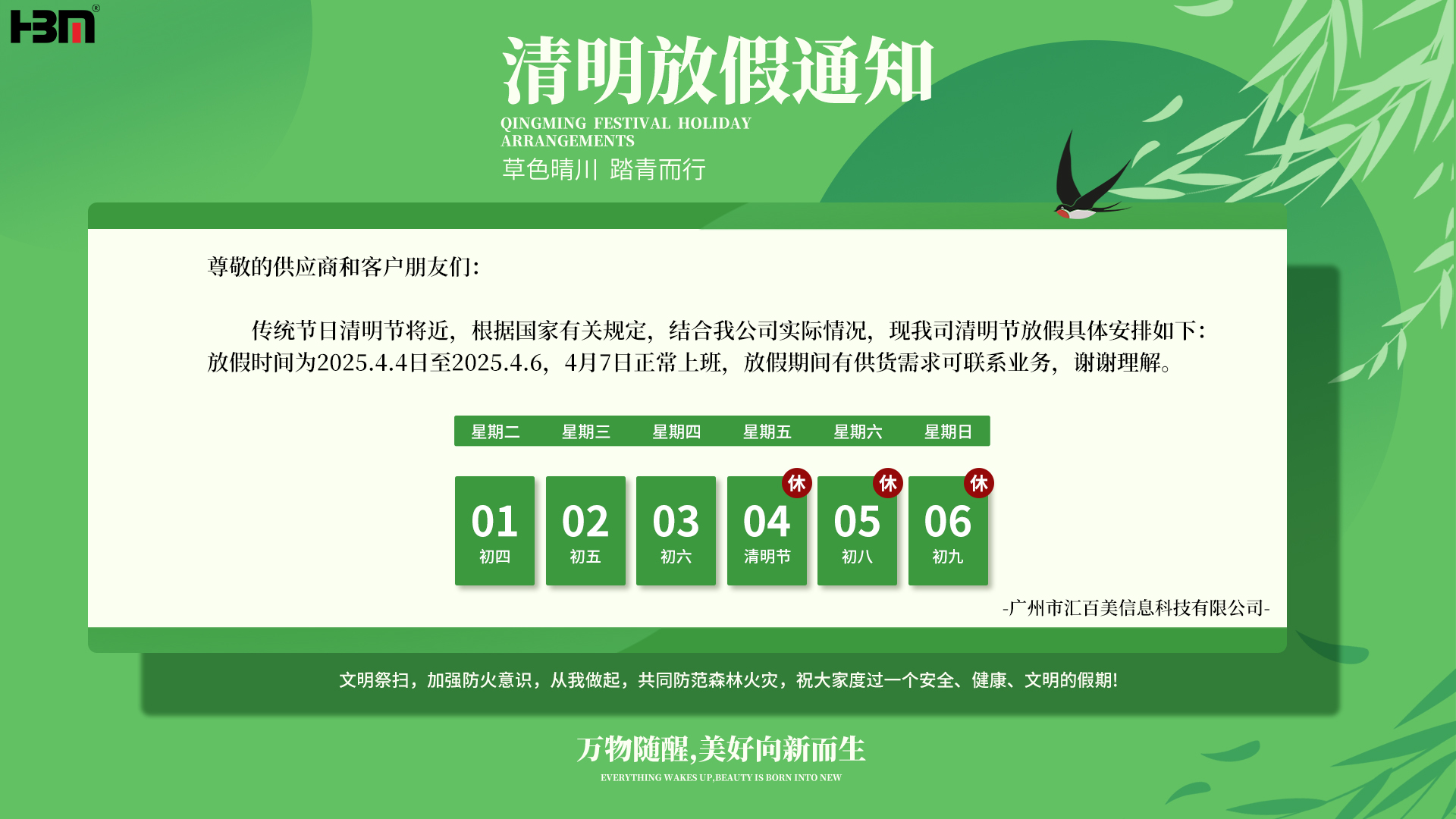 尊敬的供應(yīng)商和客戶朋友們:傳統(tǒng)節(jié)日清明節(jié)將近,根據(jù)國家有關(guān)規(guī)定,結(jié)合我公司實際情況,現(xiàn)將我司清明節(jié)放假具體安排通知如下:放假時間為: 2025.4.4日至2025.4.6,4月7日正常上班,放假期間有供貨需求可聯(lián)系業(yè)務(wù),謝謝理解.